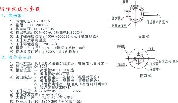 UHC型遠傳式磁浮液位計是專為監(jiān)控各種壓力容器的液位而設(shè)計的專利產(chǎn)品,它可以用在各種容器上進行液位的測量及顯示。本儀表由現(xiàn)場磁浮式液位計,磁耦式位移傳動器,磁耦式液位變送器及控制室內(nèi)液位顯示表四部分組成。磁浮式液位計利用連通器原理同容器連接,從液位計的液位指示器上可直接觀測到液位的變化,同時磁耦式位移傳動器和液位變送器通過電磁轉(zhuǎn)換把液位信號轉(zhuǎn)換成電信號,通過電纜傳輸?shù)娇刂剖覂?nèi)的液位顯示表中,經(jīng)電路處理后在顯示表上利用發(fā)光帶模擬顯示液位,顯示同現(xiàn)場的液位變化同步。顯示表還具有高液位,低液位報警及控制 輸出等項功能?,F(xiàn)場磁耦式液位變送器為隔爆型設(shè)計,防爆標志為ExdⅡCT6,產(chǎn)品經(jīng)儀器儀表防爆安全監(jiān)督檢查站審查合格。該產(chǎn)品適用于石油、化工、電站及其它工業(yè)領(lǐng)域的各種容器中液位的監(jiān)測及二次顯示。